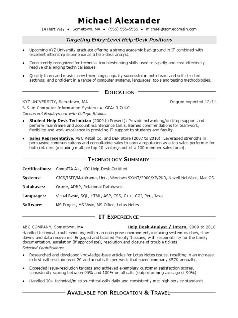 Help Desk Resume Entry Level Best Resume Examples